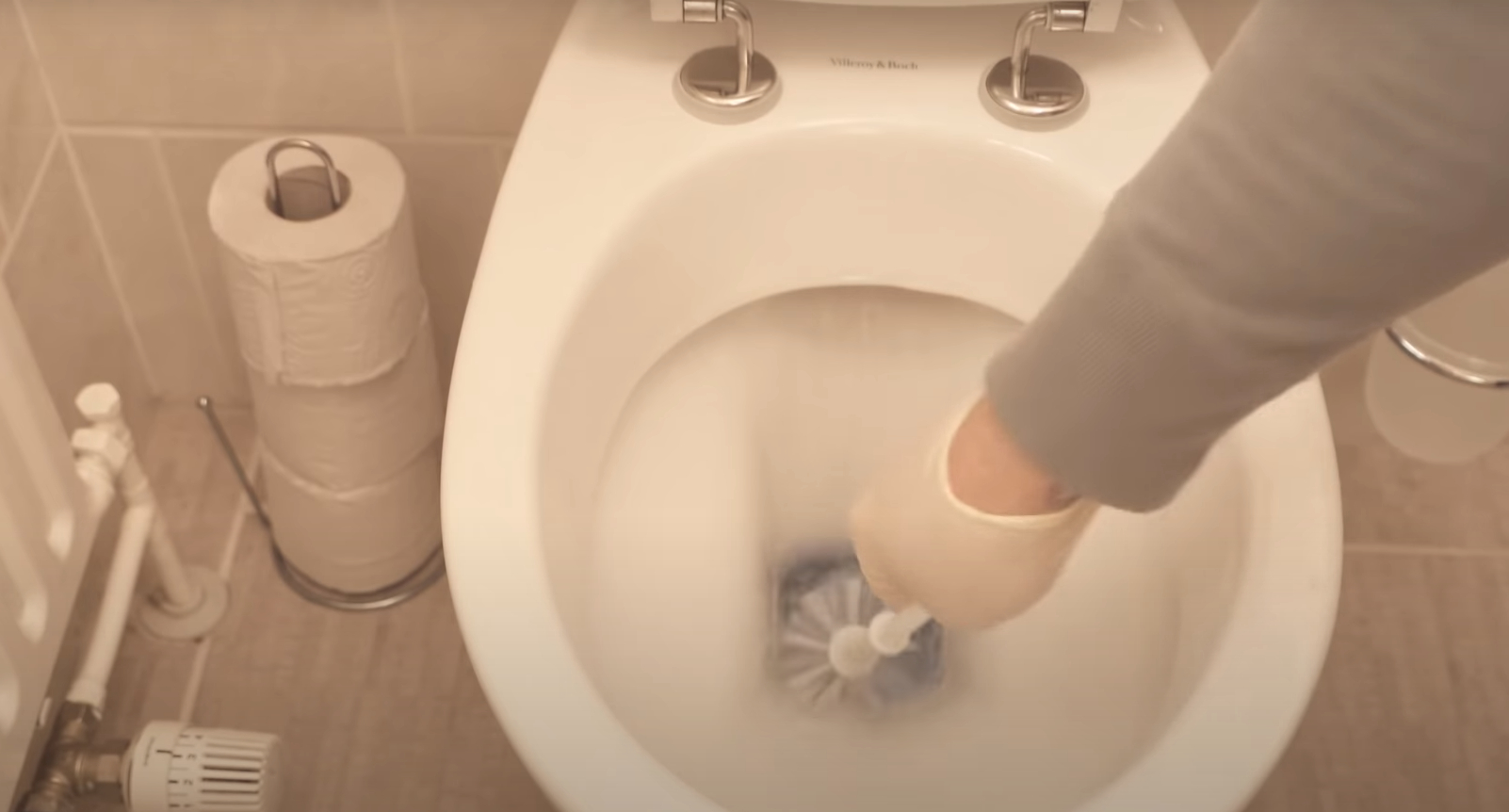 Ryte nuvalykite tualeto unitazą šepečiu kuo giliau įkišant į kanalizaciją, taip pat stipriai patrinant po tualeto kraštais.