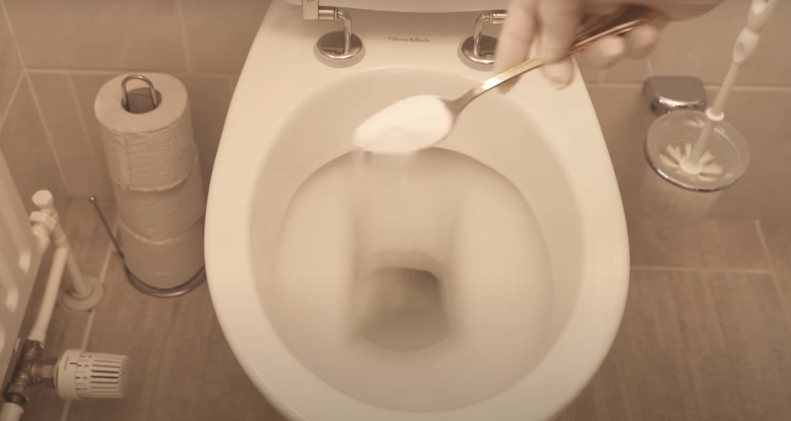 Į unitazą įpilkite šiek tiek acto, tada įberkite sodos ir palikite kuriam laikui taip pabūti.