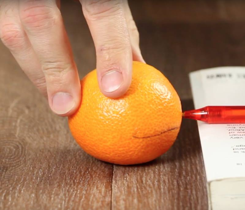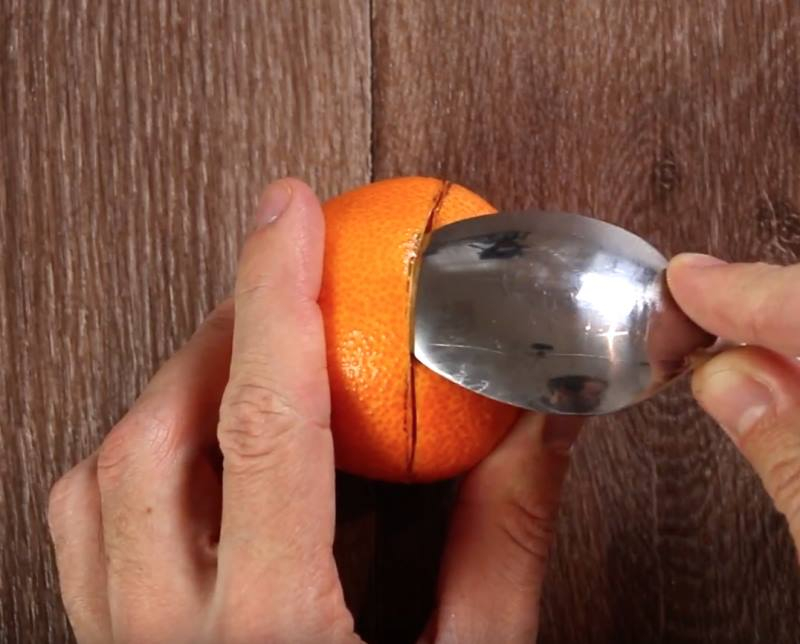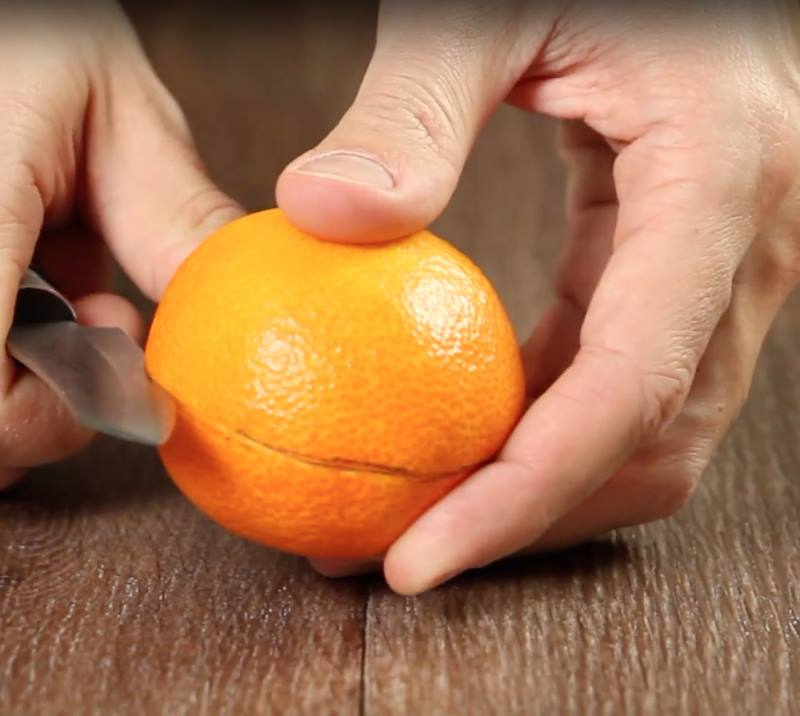 Tada atsargiai įpjaukite peiliu išilgai per visą žymę, visą laiką sukdami mandariną.