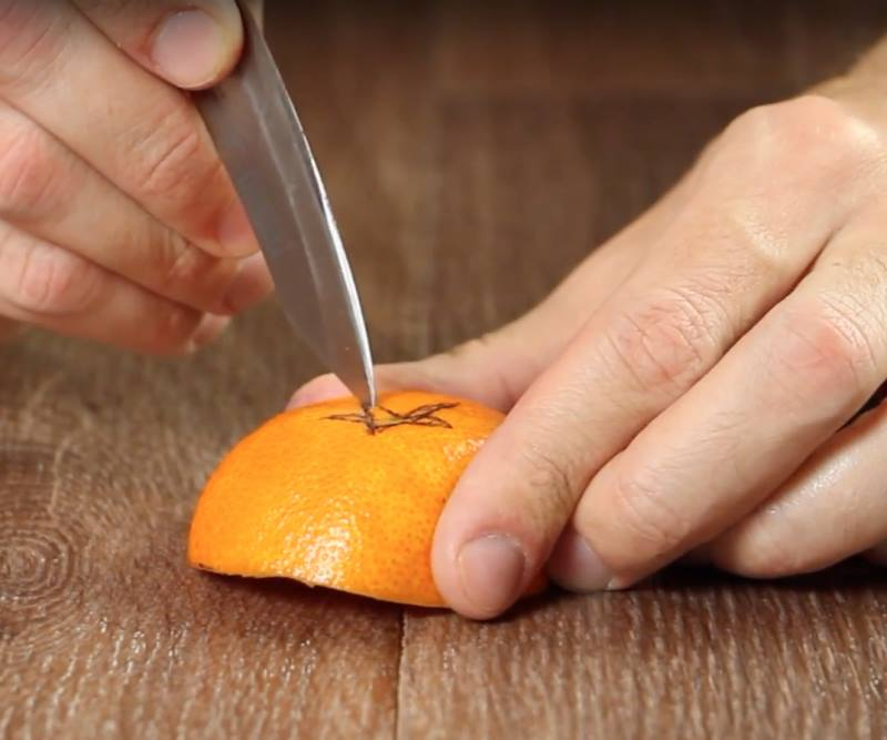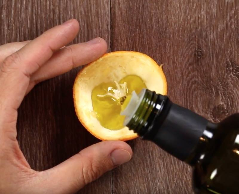 Apatinę dalį užpildykite alyvuogių aliejumi. Maža balta degimo dagtis pačiame mandarino viduryje taip pat turi būti sutepta aliejumi.