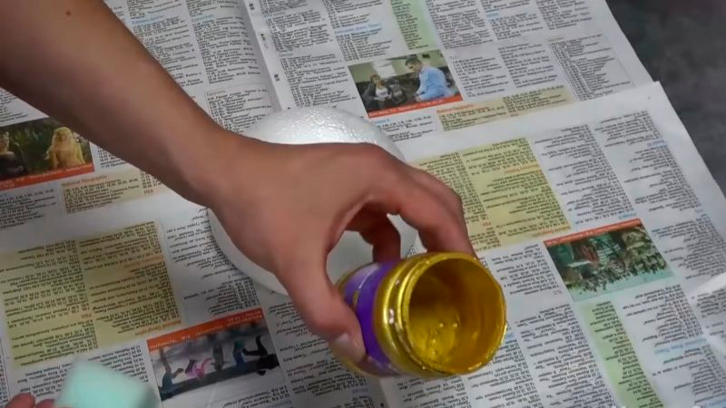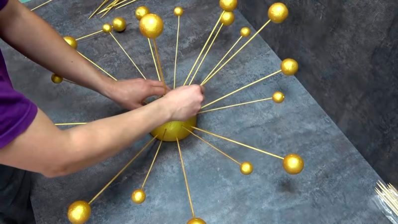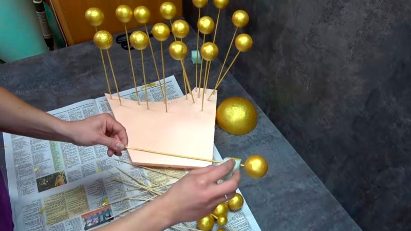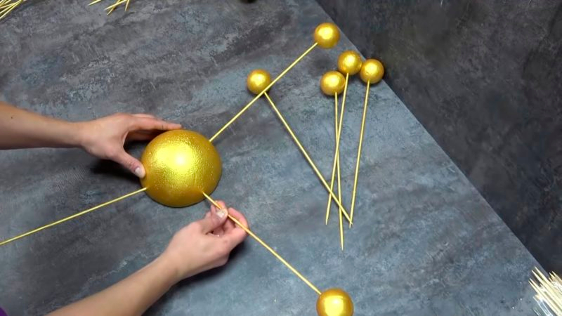 Įsmeikite pagaliukus į mažesnius polistirolo rutuliukus ir nudažykite ta pačia spalva.