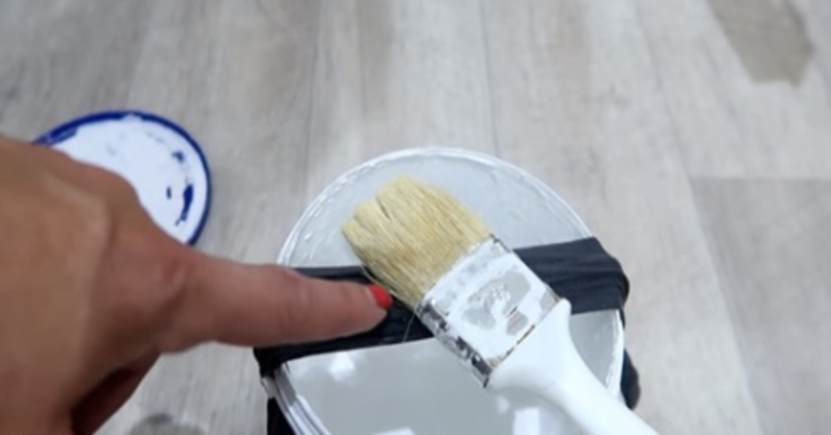 Pritvirtinkite pėdkelnės ant ant dažų indelio. Dabar lengvai galėsite nuo teptuko pašalinti dažų perteklių