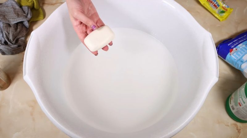 Tada į dubenį įpilkite 2 litrus švaraus, šilto vandens. Tik nenaudokite karšto vandens. Įpilkite 2 valgomuosius šaukštus kalcinuotos sodos ir 50 ml amoniako (galima įsigyti vietinėse ūkinių prekių ir statybinių prekių parduotuvėse). Taip pat pasiimkite gabalėlį gero ūkinio muilo arba specialaus muilo, skirto kovai su dėmėmis. Užsimaukite kiekvieną kojinę ant rankos, gerai ją išmuilinkite ir panardinkite į vandenį.