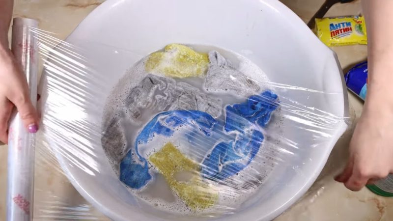 Uždenkite dubenį su šiltu vandeniu ir kojinėmis maistine plėvele. Taip bus palaikoma tinkama temperatūra ir sukuriamas pirties efektas. Nešvarumai labiau suminkštės ir kojines bus galima lengviau išskalbti. Palikite jas taip mirkti vieną valandą.