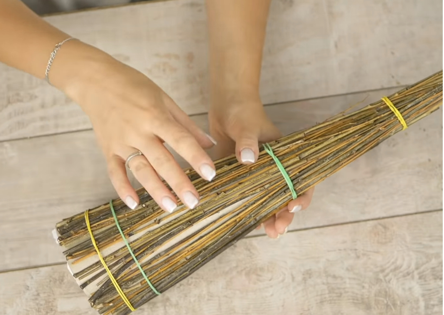 Dabar kanceliarinėmis gumelėmis tolygiai sutvirtinkite šakas aplink kūgį.