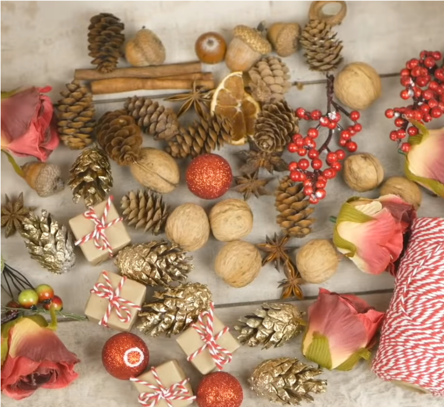 Galite naudoti, pavyzdžiui, kankorėžius, mini dovanėles, burbuliukus, dirbtines gėles, natūralias medžiagas.
