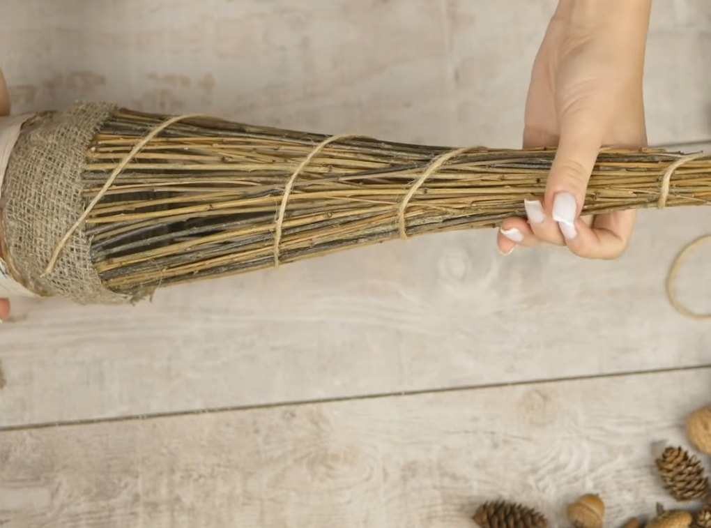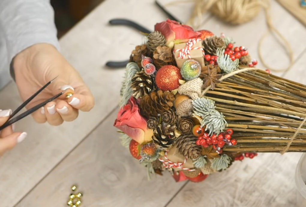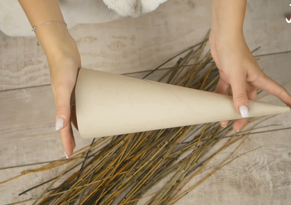 Tolygiai sudėliokite šakas per visą kūgio paviršių, kad dekoracija įgautų gražią eglutės formą ir palikite sausoje vietoje 2-3 dienas.