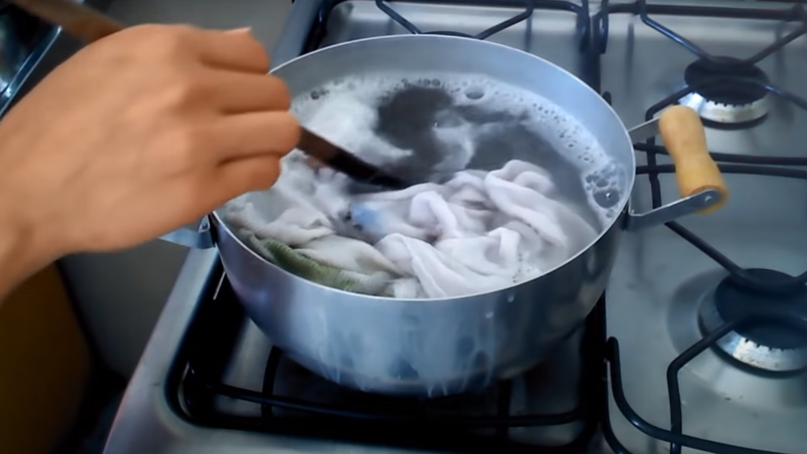 Tada atsargiai į kibirą supilkite vandenį ir visus rankšluosčius, ir palikite juos taip mirkti tol, kol vanduo atvės.