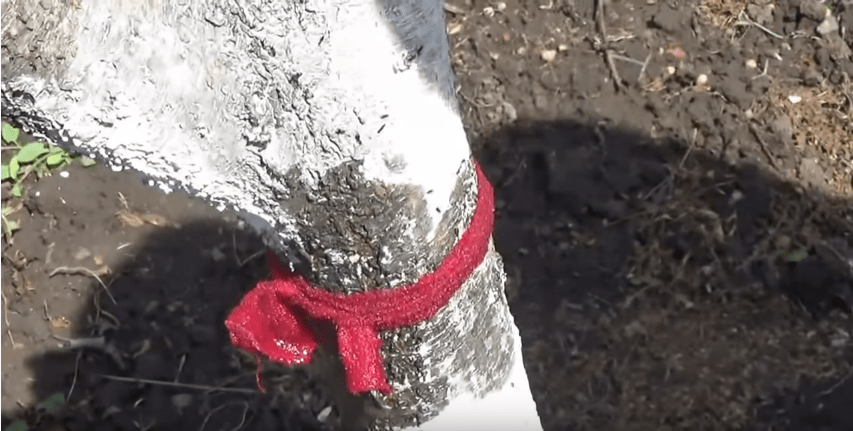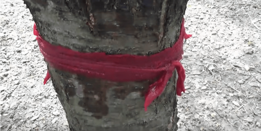 Tada tam tikroje vietoje suriškite juosteles aplink medžio kamieną. Būtinai stebėkite aliejaus kiekį ir laikas nuo laiko, kai medžiaga pradeda džiūti, vėl suvilgykite audinį aliejumi.