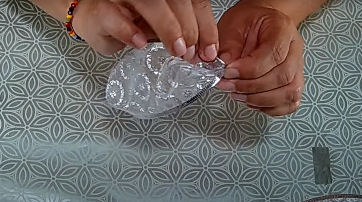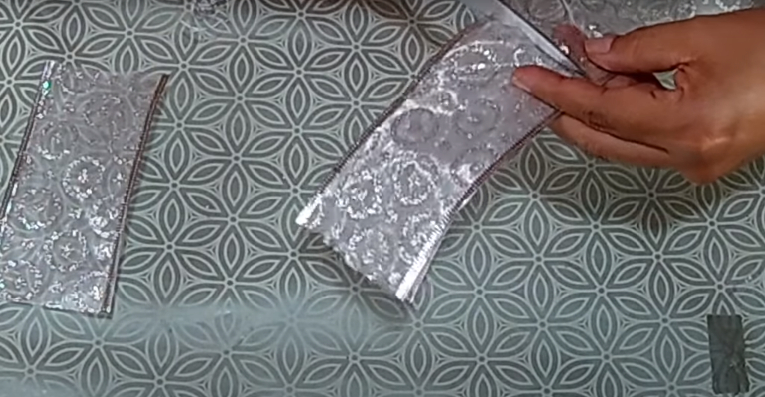 Pirmiausia paimkite organzos juostelę, liniuote išmatuokite 12 cm ilgį ir sukarpykite.