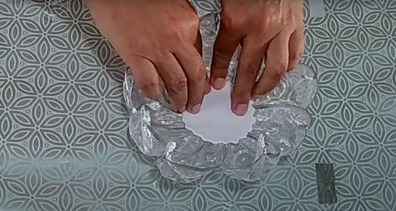 Dabar su karštų klijų pistoletu priklijuokite antrą žiedlapių sluoksnį ir gerai prispauskite centrą žirklėmis.