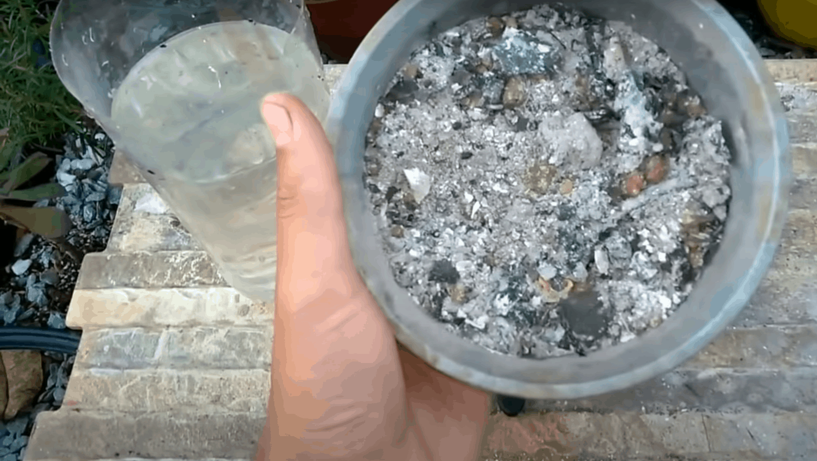Sumaišykite 1 puodelį medienos pelenų su 10 litrų vandens.