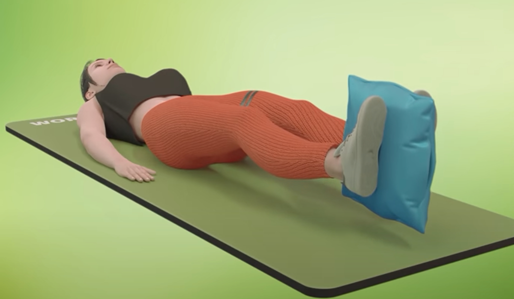 Atsigulkite lygiai ant kilimėlio ir tarp kulkšnių pasidėkite nedidelę pagalvėlę.