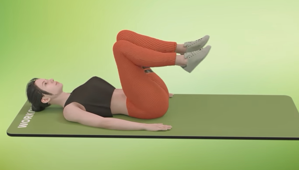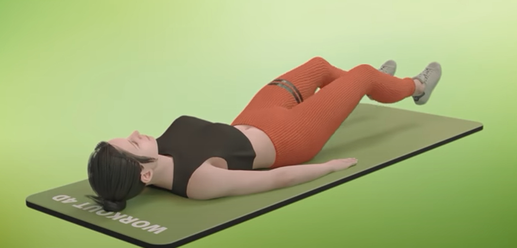 Likite gulėti toje pačioje padėtyje, bet sulenkite kojas per kelius ir pastatykite pėdas ant grindų.