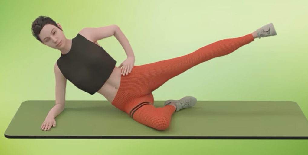 Pakeiskite padėtį, pasisukite, atsiremkite į dilbį šonu, apatinę koją laikykite sulenktą, o viršutinę ištieskite į šoną.