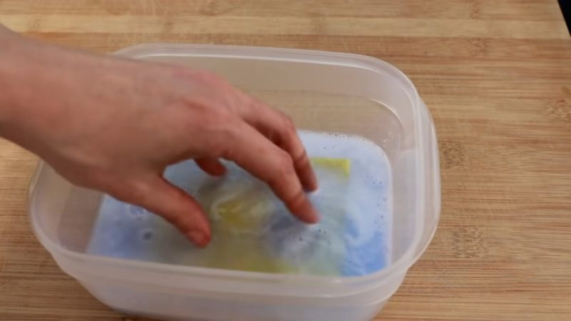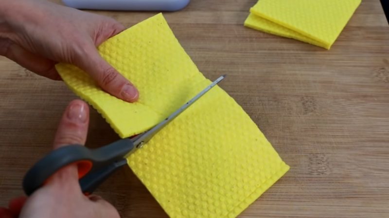 Indelyje sumaišykite 3 kamštelius minkštiklio ir 3 kamštelius vandens (santykiu 1:1). Indų plovimo šluostę padalinkite į 4 dalis.