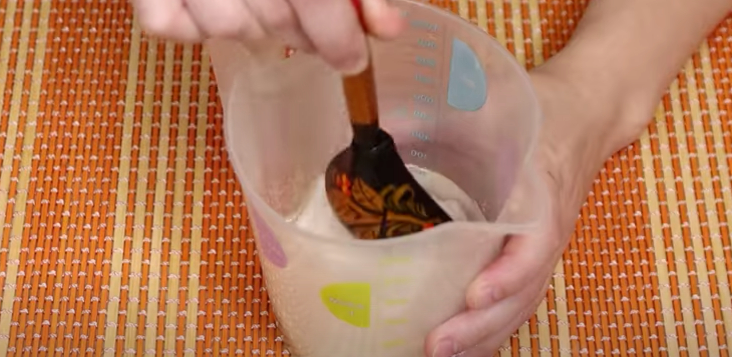 Tada į mišinį supilkite stiklinę verdančio vandens ir išmaišykite.