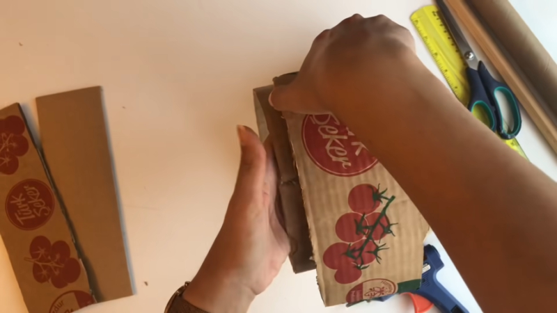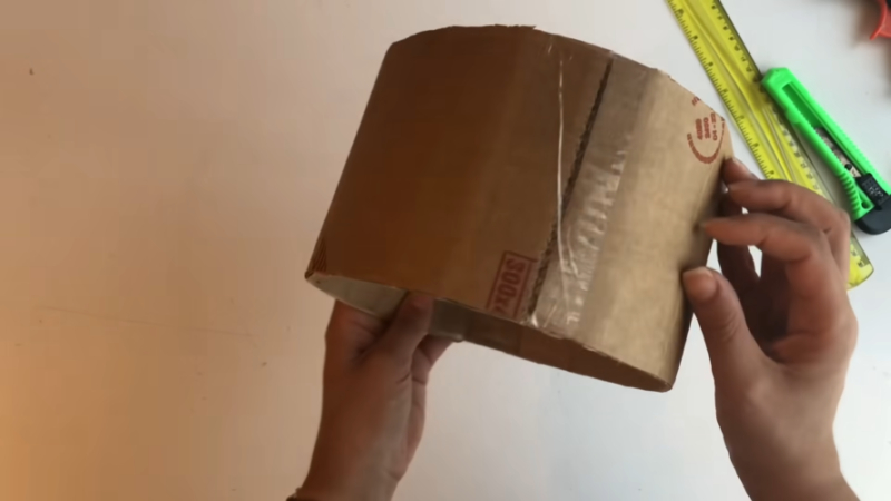 Iš šoninių dėžės sienelių išpjaukite plačias juostas, kurių bendras ilgis turėtų atitikti apskritimo ilgį. Tokiu pat būdu suminkštinkite kartoną ir cilindro viduryje priklijuokite juostelę. Sujungimams naudokite lipnią juostą.
