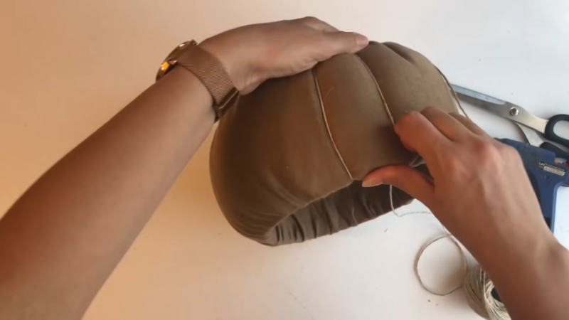 Tada ruošinys įgaus pakankamą apimtį. Kad forma būtų įdomesnė, vienodais atstumais perriškite audinį džiuto virvele.
