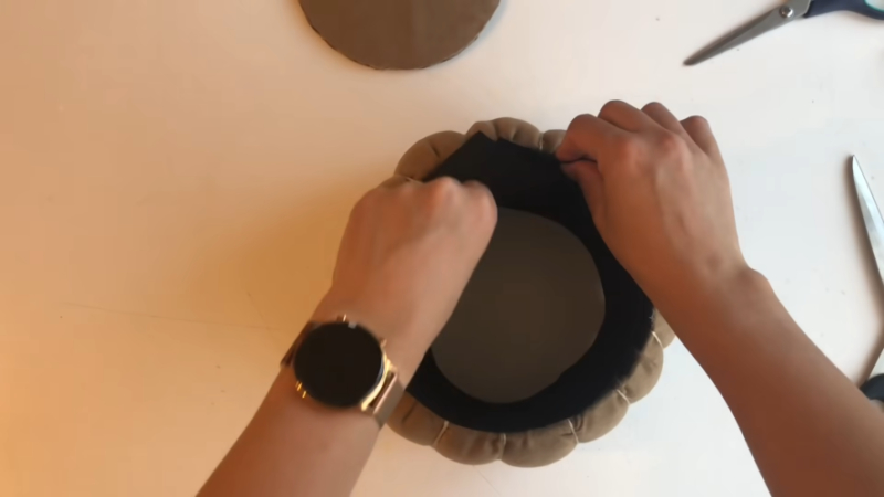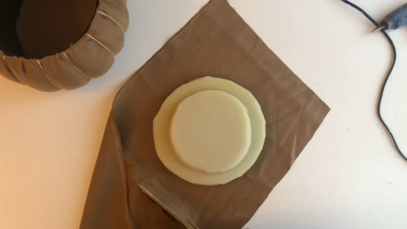 Norėdami suteikti dangčiui reikiamą tūrį, iš porolono išpjaukite du apvalius ruošinius. Vienas iš jų turi atitikti šablono parametrus, o antrasis turi būti mažesnio dydžio. Prie kartono priklijuokite didesnį porolono apskritimą ir ant jo vidurio įstatykite antrąjį, mažesnį.