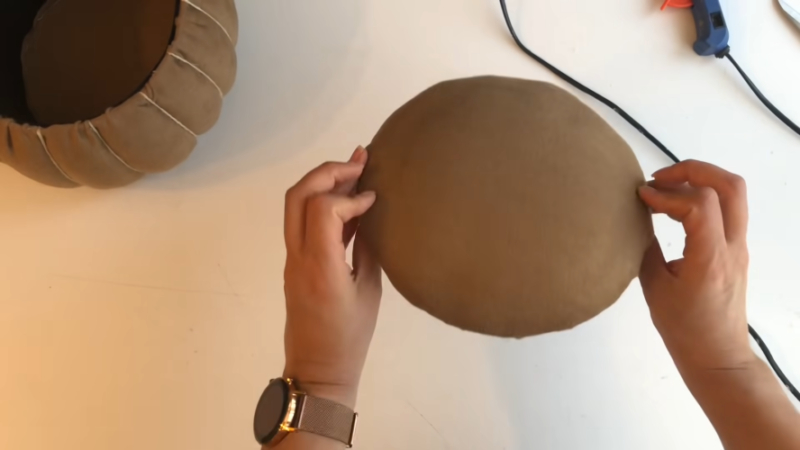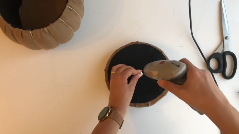 Suklijuokite vieną dugno dalį su pamušalo puse viduje, po to uždėkite klijų per visą perimetrą ir sujunkite su antrąja dalimi. Išilgai apačios apvyniokite dekoratyvinę virvelę, kad paslėptumėte klijus.