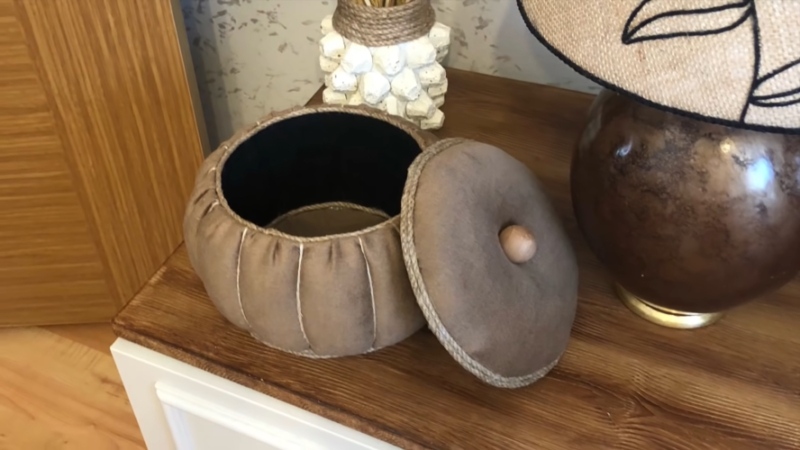 Dangčio ir statinaitės viršaus kraštus apjuoskite dekoratyvine virvele, kad uždengtumėte sujungimus. Interjero dėžutė jau paruošta, belieka nuspręsti, ką joje norėsite laikyti. Graži ir funkcionali dėžutė, be abejo, bus puiki interjero detalė. Daugelis žmonių net nesusimąstytų, kad ji pagaminta iš paprastos daržovių dėžės.