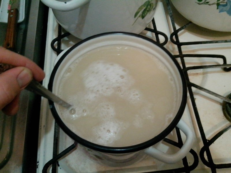 Supilkite mišinį į nedidelius indelius. Atvėsęs skystis sutirštės. Gautą mišinį praskieskite vandeniu, santykiu 1:1, supilkite į buteliukus ir naudokite kaip indų ploviklį.