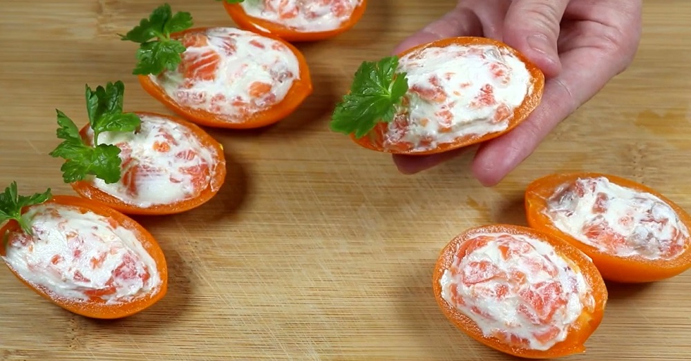 Paruoštu įdaru įdarykite pomidorų puseles ir papuoškite petražolėmis. Pomidorų užkandis jau paruoštas.