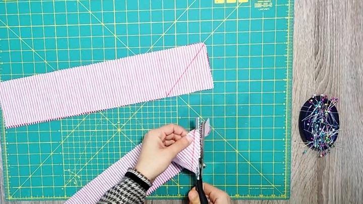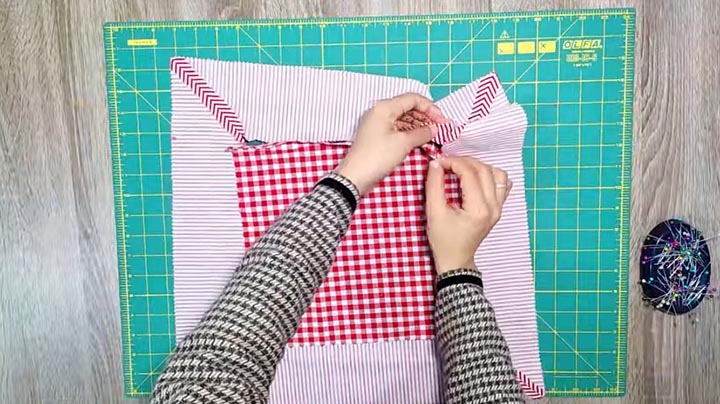Paruoškite trijų spalvų audinį: vieną – pagalvėlės nugarėlei (42×42 cm), antrą – apvadams (4 gabalai po 46×10 cm), trečią – centrinei daliai (kvadratui) 28×28 cm. Sulenkite pagalvėlėms skirtus audinius vieną prie kito, po dvi juostas. Išmatuokite 10 cm nuo krašto ir nubrėžkite brūkšninę liniją iki kampo. Susiūkite siuvimo mašina. Nukirpkite visus nepageidaujamas audinio dalis.
