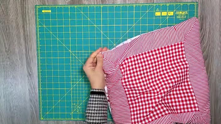Po to paeiliui sudėkite šias dalis: sinteponą (arba kitą užpildymui tinkamą medžiagą), susiūtą kvadratinį ruošinį ir apvadus, medžiagą nugarai (nugarine puse į vidų). Siuvimo mašina susiūkite aplink kraštus, palikdami nedidelę angą, kad galėtumėte išversti. Nukirpkite audinio perteklių palei kraštus.