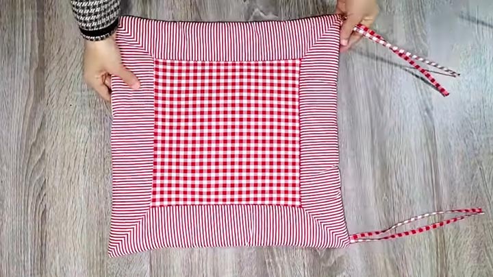Išverskite audinį, rankomis susiūkite skylę. Pagalvėlės šonuose galite prisiūti audinio juosteles (raištelius), tačiau tai nėra privaloma. Sėdynės pagalvėlė paruošta!