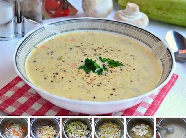 Greitai paruošiama sriuba su cukinijomis, grybais ir lydytu sūriu