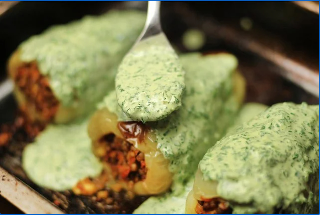 Originaliai grikiais įdarytos paprikos su daržovių padažu