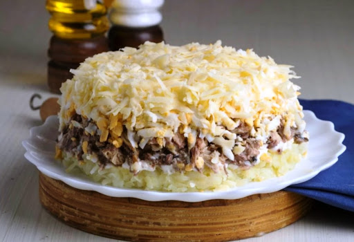 Sluoksniuotos salotos su vištienos kepenėlėmis