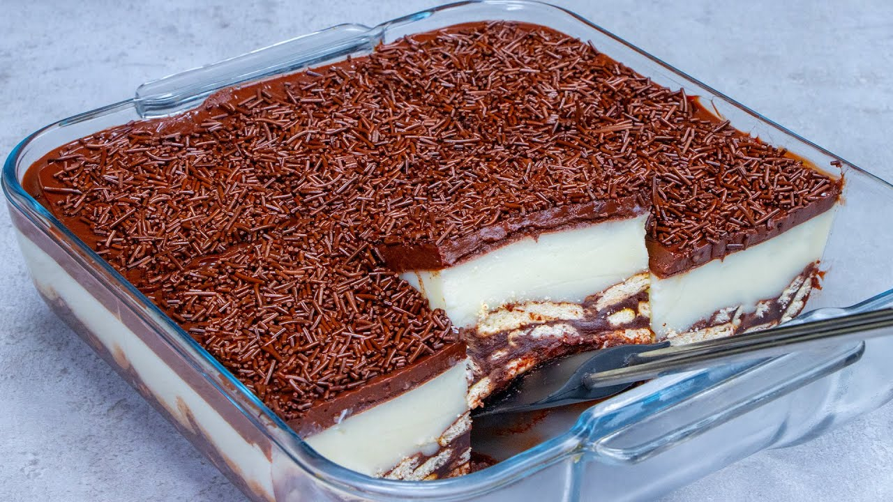 Nekeptas puikaus skonio desertas. Sausainių pagrindas su gardžiu vanilės ir šokoladiniu kremu!