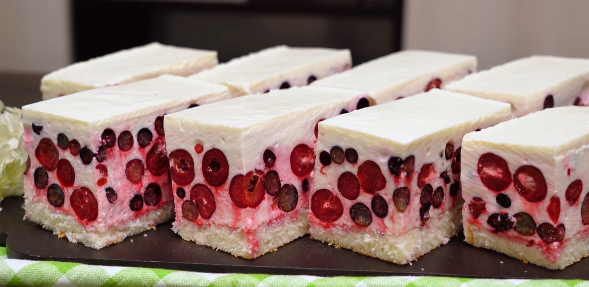 Vasariškas kreminis desertas su vyšniomis ir serbentais. Biskvitas, skanus kremas ir gaivūs vaisiai!