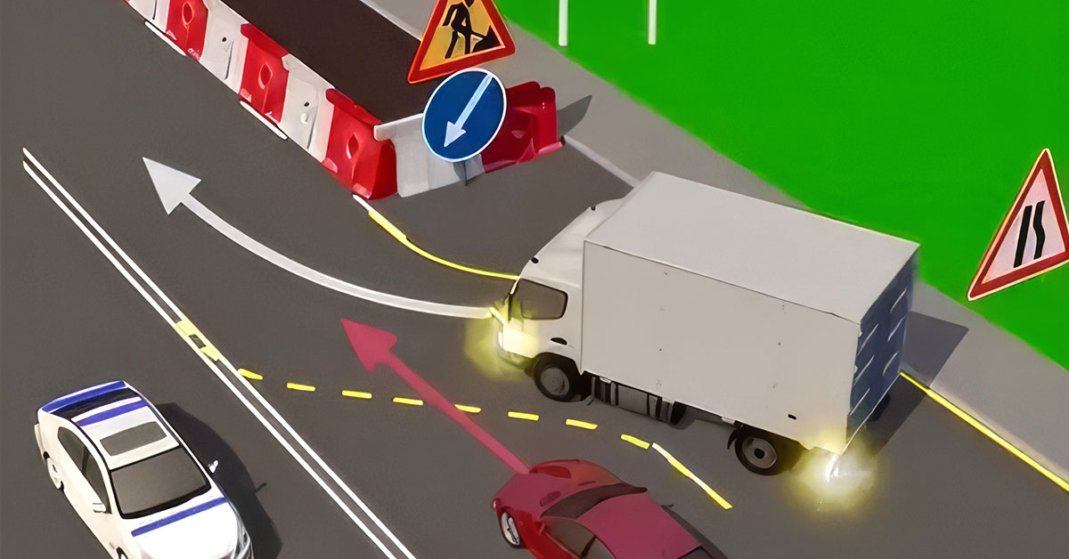Faktas yra tai, kad mes susiduriame su laikinu kelių ženklinimu (žymimu geltona spalva). Tai, kaip ir laikini ženklai, turi pirmenybę. Būtent todėl pagal ženklinimą baigiasi kairioji eismo juosta prieš teritoriją, kurioje atliekami remonto darbai. Dešinioji juosta tęsiasi į priekį, išvengdama kliūčių. Kaip galima numanyti, norint važiuoti toliau, lengvojo automobilio savininkui reikia persirikiuoti.
