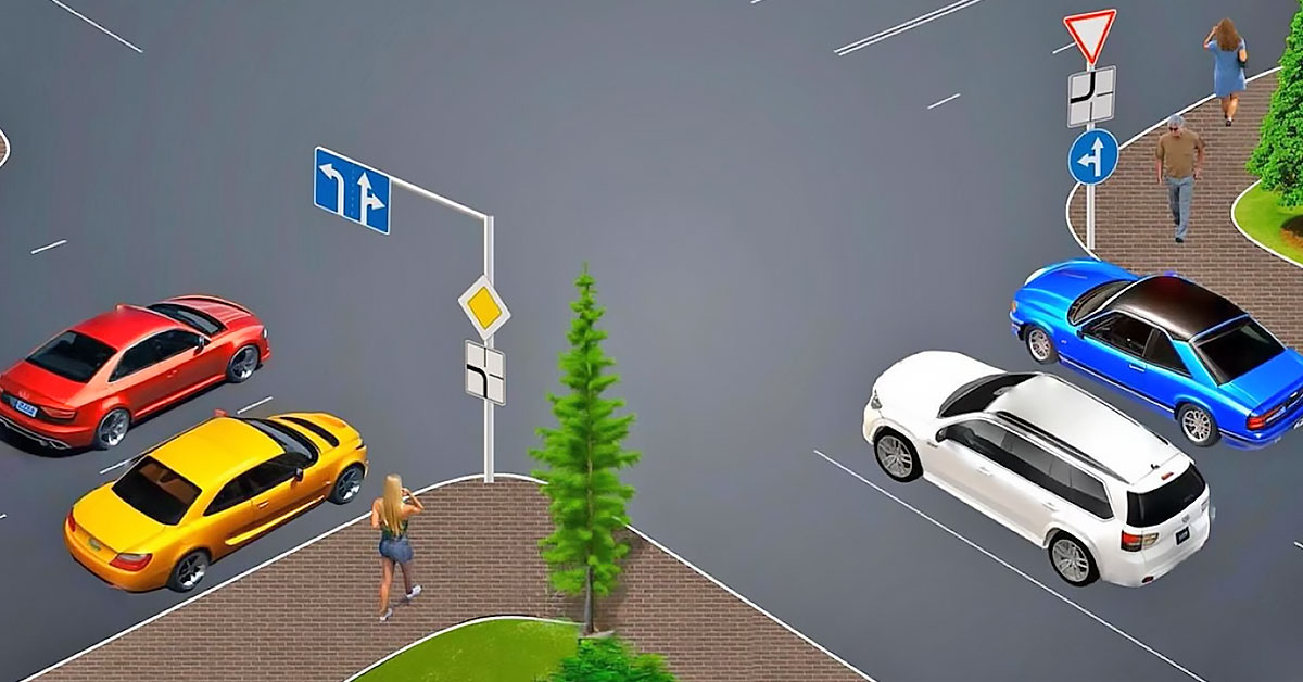 Situacija su geltonu automobiliu yra labai paprasta. Laikantis kelių eismo taisyklių, šios transporto priemonės vairuotojas, būdamas dešinėje eismo juostoje, gali judėti tiesiai ir į dešinę. Panašioje situacijoje atsidūrė ir baltas automobilis. Tik jis, priešingai nei geltonas automobilis, gali judėti tiesiai, į kairę ir apsisukti.